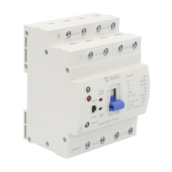 Автоматичний перемикач вводу резерву TAKEL ASM-12-63 4P 63A — це пристрій для автоматичного перемикання між основним та резервним джерелами живлення у трифазних електромережах. Забезпечує безперервну подачу електроенергії у разі зникнення або нестабільності напруги.