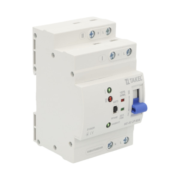Модульний автоматичний перемикач введення резерву TAKEL ME-80 призначений для організації резервного електроживлення в однофазних електричних мережах. Пристрій забезпечує перемикання між основним та резервним джерелом живлення, що дозволяє підтримувати безперервну подачу електроенергії до навантаження.