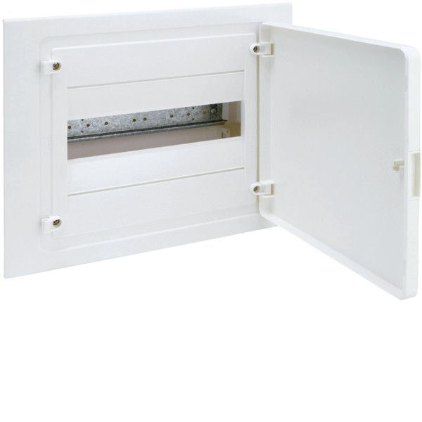 Розподільчий щит Hager Golf (VF112PD) — модульний пластиковий корпус для прихованого монтажу в стінову нішу. Розрахований на 12 модулів (1 ряд по 12), оснащений білими непрозорими дверцятами з можливістю встановлення зліва або справа.