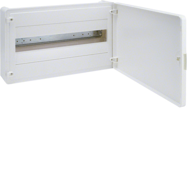 Розподільчий щит Hager Golf (VS118PD) — модульний пластиковий корпус для зовнішнього (навісного) монтажу на стіну. Розрахований на 18 модулів (1 ряд по 18), оснащений білими непрозорими дверцятами з можливістю встановлення зліва або справа.