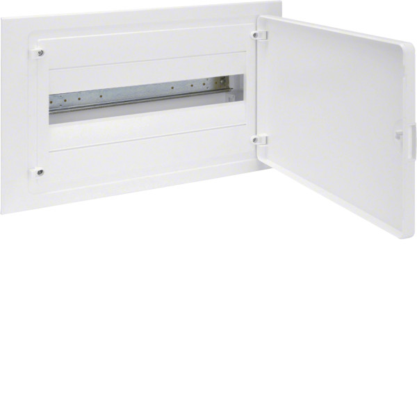 Розподільчий щит Hager Golf (VF118PD) — модульний пластиковий корпус для прихованого монтажу в стінову нішу. Розрахований на 18 модулів (1 ряд по 18), оснащений білими непрозорими дверцятами з можливістю встановлення зліва або справа.