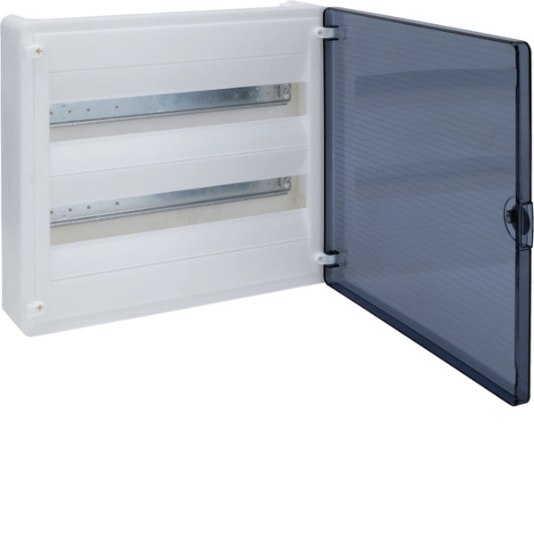 Розподільчий щит Hager Golf (VS218TD) — модульний пластиковий корпус для зовнішнього (навісного) монтажу на стіну. Розрахований на 36 модулів (2 ряди по 18), оснащений прозорими дверцятами з можливістю встановлення зліва або справа.