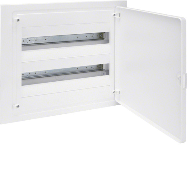 Розподільчий щит Hager Golf (VF218PD) — модульний пластиковий корпус для прихованого монтажу в стінову нішу. Розрахований на 36 модулів (2 ряди по 18), оснащений білими непрозорими дверцятами з можливістю встановлення зліва або справа.