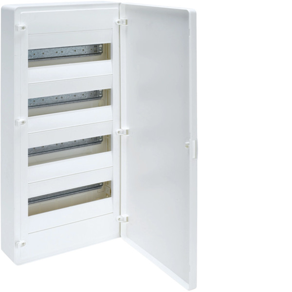 Розподільчий щит Hager Golf (VS412PD) — модульний пластиковий корпус для зовнішнього (навісного) монтажу на стіну. Розрахований на 48 модулів (4 ряди по 12), оснащений білими непрозорими дверцятами з можливістю встановлення зліва або справа.