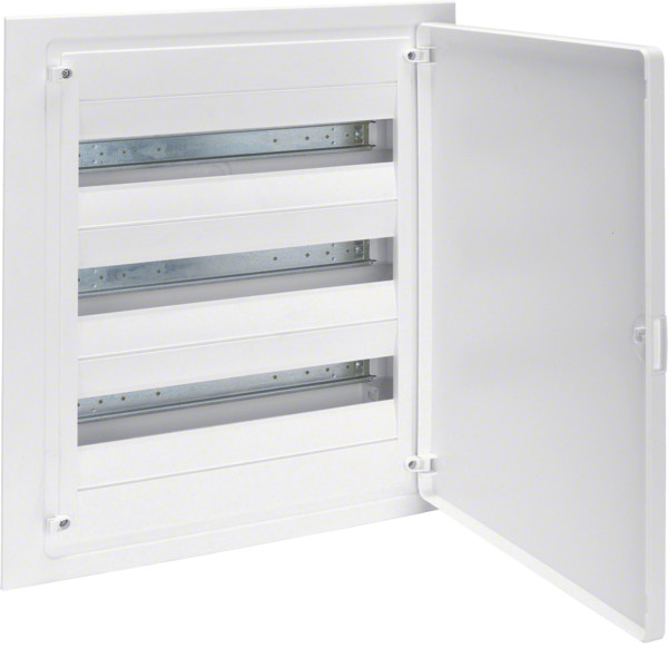 Розподільчий щит Hager Golf (VF318PD) — модульний пластиковий корпус для прихованого монтажу в стінову нішу. Розрахований на 54 модулів (3 ряди по 18), оснащений білими непрозорими дверцятами з можливістю встановлення зліва або справа.