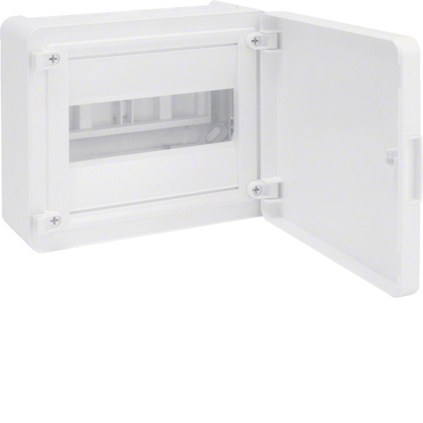 Розподільчий щит Hager Golf (VS108PD) — модульний пластиковий корпус для зовнішнього (навісного) монтажу на стіну. Розрахований на 8 модулів (1 ряд по 8), оснащений білими непрозорими дверцятами з можливістю встановлення зліва або справа.