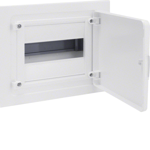 Розподільчий щит Hager Golf (VF108PD) — модульний пластиковий корпус для прихованого монтажу в стінову нішу. Розрахований на 8 модулів (1 ряд по 8), оснащений білими непрозорими дверцятами з можливістю встановлення зліва або справа.