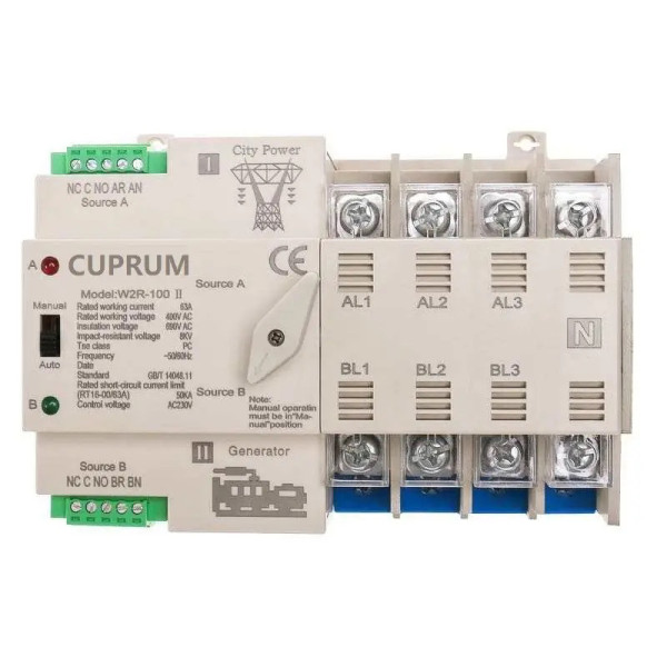 Автоматический четырехполюсный переключатель резервного питания (АВР) Cuprum W2Rм 100A обеспечивает автоматическое переключение между основным и резервным источником питания в трехфазных электросетях. Устройство гарантирует стабильное функционирование электрооборудования даже в случае отключения основного источника энергии. Особенности конструкции: