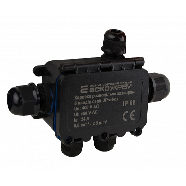 Распределительная коробка с клеммами Аско-Укрем UProbox IP68 на 4 ввода тип В (A0280010004) обеспечивает надежную защиту и удобное разветвление кабелей. Корпус из огнестойкого поликарбоната и степень защиты IP68 позволяют выдерживать даже кратковременное полное погружение в воду, предохраняя контактные соединения от пыли и влаги. Силиконовые уплотнители гарантируют надежную герметизацию, а продуманная конструкция с ребрами жесткости на крышке обеспечивает ее прочность. Универсальный черный цвет корпуса подходит для различных монтажных сред, а рабочий диапазон температур от -40°С до +105°С позволяет использование в экстремальных условиях.
