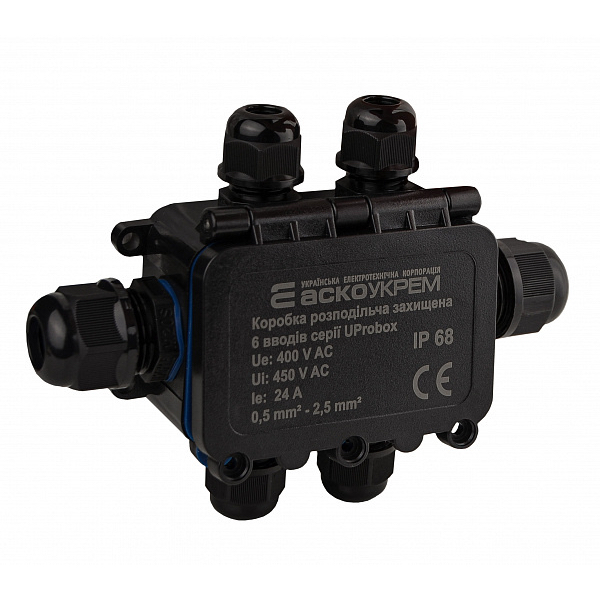 Распределительная коробка с клеммами Аско-Укрем UProbox IP68 на 6 вводов (A0280010006) обеспечивает надежную защиту и удобное разветвление кабелей. Корпус из огнестойкого поликарбоната и степень защиты IP68 позволяют выдерживать даже кратковременное полное погружение в воду, предохраняя контактные соединения от пыли и влаги. Силиконовые уплотнители гарантируют надежную герметизацию, а продуманная конструкция с ребрами жесткости на крышке обеспечивает ее прочность. Универсальный черный цвет корпуса подходит для различных монтажных сред, а рабочий диапазон температур от -40°С до +105°С позволяет использование в экстремальных условиях.