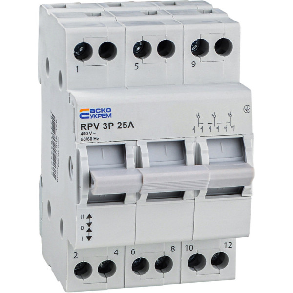 Переключатель нагрузки RPV 3P 25A от АСКО предназначен для ручного переключения источников питания в электрических сетях. Чаще всего используется для переключения электропитания с основной сети на резервный источник — например, генератор или другую альтернативную систему питания.