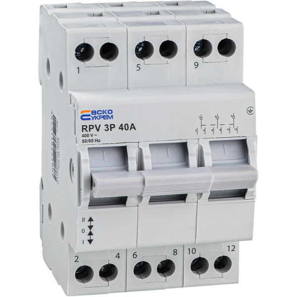 Переключатель нагрузки RPV 3P 40A от АСКО предназначен для ручного переключения источников питания в электрических сетях. Чаще всего используется для переключения электропитания с основной сети на резервный источник — например, генератор или другую альтернативную систему питания.