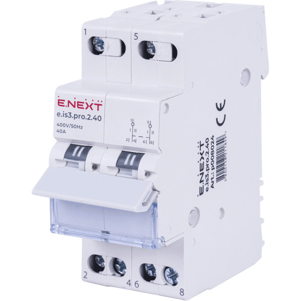 Трехпозиционный переключатель E.NEXT e.is3.pro.2.40 используется в электрических щитах для ручного переключения между источниками питания (например, сеть – резервный источник) или для отключения электрических цепей во время технического обслуживания.